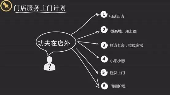洞悉數(shù)據(jù)背后有故事,以大賣(mài)場(chǎng)為例:(1)8:30-10:30,超市迎來(lái)約20%的顧客,九成是老年人,最?lèi)?ài)買(mǎi)鮮肉,雞蛋,蔬菜;(2)12:00-16:00,迎來(lái)少于20%顧客,但可能是有錢(qián)又閑的主;(3)18:00-20:00,迎來(lái)超五成的顧客,上班族全家出動(dòng)。數(shù)據(jù)指導(dǎo)很關(guān)鍵,要把數(shù)據(jù)本身進(jìn)行標(biāo)準(zhǔn)化動(dòng)作,把周一到周五、節(jié)假日、早中晚都做出精細(xì)化標(biāo)準(zhǔn)。 5、門(mén)店服務(wù)上門(mén)計(jì)劃(客服能力) 有時(shí)候采訪(fǎng)實(shí)體店老板,了解到一種情況:很多時(shí)候他們拉來(lái)的顧客流失了,新顧客增長(zhǎng)得很慢。這種情況更多的是靠門(mén)店自身的提高,要做好很多服務(wù)的工作。一方面客戶(hù)流失很快,另一方面拉新成本很高,這就需要提升門(mén)店自身的客服能力,積累客戶(hù)。