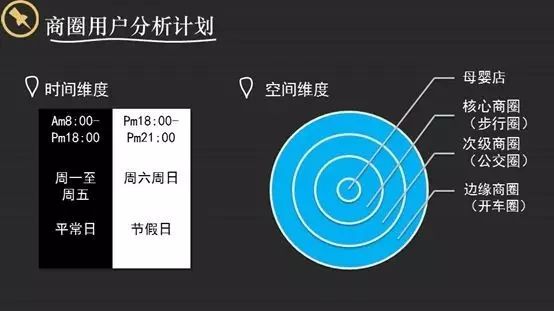 a.門(mén)店 整潔清爽;b.陳列密集,且讓顧客方便可尋;c.多樣化的POP,讓商品自己說(shuō)話(huà);d.完善的功能分區(qū)(親子,休息,試衣);e.引客區(qū),讓顧客感受物美價(jià)廉;f.收銀臺(tái)展示小物件,隨手可得。所謂精益管理,就是做好每個(gè)細(xì)節(jié)。 4、商圈用戶(hù)分析計(jì)劃 消費(fèi)者方面的兩個(gè)維度:一個(gè)是時(shí)間的維度,一天的時(shí)間,周一到周五,節(jié)假日;一個(gè)是空間的維度,核心的步行圈,公交圈、開(kāi)車(chē)圈,這些消費(fèi)者是不一樣的。