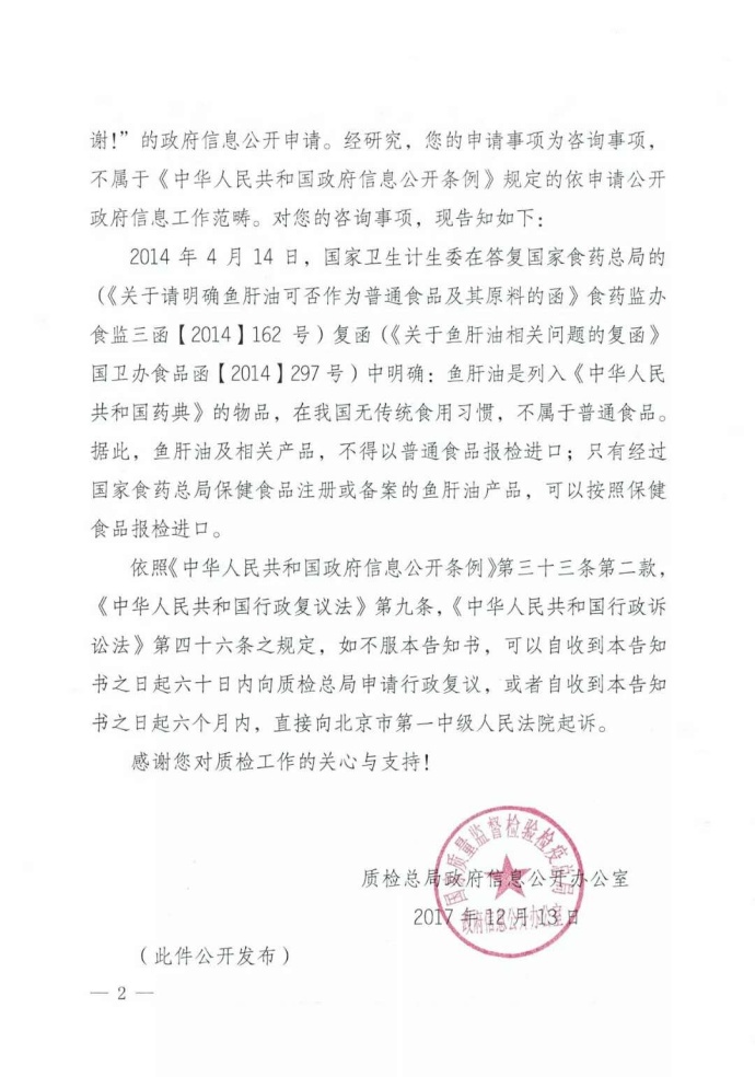 近日,國(guó)家質(zhì)檢總局在一份政府信息公開告知書中再次明確:魚肝油及相關(guān)產(chǎn)品,不得以普通食品報(bào)檢進(jìn)口;只有經(jīng)過國(guó)家食藥總局保健食品注冊(cè)或備案的魚肝油產(chǎn)品,可以按照保健食品報(bào)檢進(jìn)口。 詳細(xì)信息見下文內(nèi)容:
