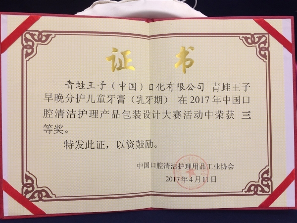 | 青蛙王子早晚分護(hù)兒童牙膏榮獲中國口腔清潔護(hù)理產(chǎn)品包裝設(shè)計(jì)大賽三等獎(jiǎng) |