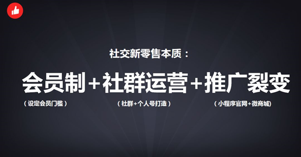 社交新零售本質(zhì)是會員制+社群運(yùn)營+推廣裂變 流量是一切生意的本質(zhì)。如果你有門店一定要讓客戶花低成本的價(jià)格,讓他到店來體驗(yàn),建立信任交易,成為自家魚塘后,可關(guān)注小程序、公眾號等,留存到線上之后,再幫你傳播裂變。此外,微信生態(tài)絕對是布局私域流量很重要的載體,未來幾年它也是最好的,F(xiàn)在微信小程序月活躍達(dá)到了3億,整個微信的月活有11億,這些巨大的流量,就是我們可以做事情的一些來源,因?yàn)橛辛髁康牡胤骄陀猩虣C(jī)。 以前我們做生意只關(guān)注客量、轉(zhuǎn)化率、客單價(jià)這三個詞,但現(xiàn)在運(yùn)營的過程當(dāng)中發(fā)生了巨大的變化,在于我們有沒有把用戶當(dāng)做流量來重點(diǎn)運(yùn)營轉(zhuǎn)化率的事情,有沒有把你的客戶當(dāng)做一個真正的人,然后挖掘這個人背后可以給你帶來的更多價(jià)值。所以有門店的老板要記得,你的導(dǎo)購跟你的消費(fèi)者之間建立的這種社交關(guān)系鏈越好,生意就越好,未來絕對是這樣的過程。 社交新零售本質(zhì)是會員制+社群運(yùn)營+推廣裂變。首先讓消費(fèi)者成為我們的會員或者粉絲,然后是社群運(yùn)營,微信絕對是最好的生態(tài),其中微信好友數(shù)超過5000的個人號已達(dá)到180萬,現(xiàn)在微信好友的數(shù)量已經(jīng)快突破5000了,通過掃碼進(jìn)群的人數(shù)從原來的100人升級成現(xiàn)在的200人了。微信雖然不在個人號上面做一些鼓勵的動作,但它在技術(shù)和真正的功能上面為大家開辟了更多的可能。最后是推廣裂變,承載的工具可以是小程序、微商城等。