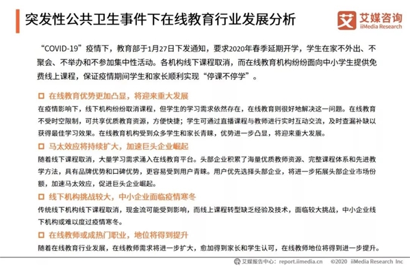 2020年初,受疫情影響,教育部于1月27日發(fā)布《關(guān)于2020年春季學(xué)期延期開學(xué)的通知》,要求各地學(xué)校推遲2020年春季學(xué)期開學(xué)時間,學(xué)生在家不外出、不聚會、不舉辦和不參加集中性活動。各教育機構(gòu)線下課程取消,但學(xué)生學(xué)習(xí)需求依然存在,而在線教育不受時空限制、可共享優(yōu)質(zhì)教育資源,有利于解決這一問題。為充分滿足疫情期間學(xué)習(xí)需求,學(xué)而思網(wǎng)校、新東方在線、掌門教育等在線機構(gòu)紛紛面向中小學(xué)生開放免費線上課程,保障學(xué)生和家長順利實現(xiàn)安心在家學(xué)習(xí)。