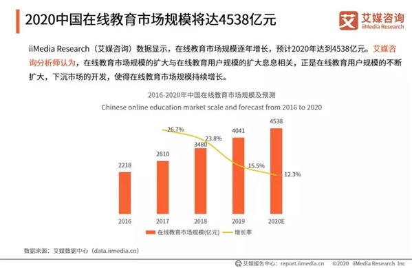 隨著互聯(lián)網(wǎng)技術(shù)快速發(fā)展、社會對教育重視程度提高、經(jīng)濟水平不斷提高,在線教育行業(yè)持續(xù)增長。iiMedia Research(艾媒咨詢)數(shù)據(jù)顯示,2020中國在線教育用戶規(guī)模將達3.09億人,市場規(guī)模將達4538億元。在在線教育用戶調(diào)查中,34.5%用戶表示對K12在線教育有一定了解;38.1%用戶認為教學(xué)講解環(huán)節(jié)與技術(shù)相結(jié)合的關(guān)系密切;44.8%用戶表示繼續(xù)觀望在線素質(zhì)教育發(fā)展前景;思維和編程類在線素質(zhì)教育中最受用戶認可,占比37.2%。艾媒咨詢分析師認為,受政策利好、社會教育意識加強以及中小學(xué)學(xué)生升學(xué)壓力的影響,未來K12在線教育市場需求將繼續(xù)增大。而隨著80年、90后父母教育意識的增強,素質(zhì)教育需求也將愈加迫切。 編程貓,松鼠AI,英孚青少兒英語,DaDa英語,好未來集團,掌門教育,作業(yè)幫,猿輔導(dǎo),阿卡索少兒英語,米樂教育,考研幫,學(xué)堂在線,尚德機構(gòu),MOOC學(xué)院,海風(fēng)教育,學(xué)而思網(wǎng)校,新東方在線教育,VIPKID,中公教育,網(wǎng)易云課堂,憂思1對1,三好網(wǎng),學(xué)霸君1對1,駕考大全,元貝駕考,車輪駕考通,駕校一點通,伴魚繪本,寶貝聽聽,口袋故事,寶寶巴士兒歌,小伴龍,駕考寶典等 在線教育不受時空限制,有利于促進優(yōu)質(zhì)教育資源共享,進一步推動教育公平。在政策利好、信息技術(shù)浪潮以及消費升級的推動下,中國在線教育市場規(guī)模、用戶規(guī)模不斷擴大。2020年初,因“COVID-19”疫情持續(xù)發(fā)展,線下課程紛紛取消,上億學(xué)生涌入在線教育平臺,為中國在線教育行業(yè)發(fā)展帶來影響與挑戰(zhàn)。本次iiMediaResearch(艾媒咨詢)“2019-2020年中國在線教育行業(yè)發(fā)展研究報告”主要是針對疫情下的K12教育、素質(zhì)教育等在線教育領(lǐng)域進行市場解讀、用戶研究以及未來趨勢預(yù)測。 疫情加速在線教育行業(yè)發(fā)展,市場規(guī)模爆發(fā)增長 中國在線教育市場規(guī)模及用戶規(guī)模逐年增長,iiMedia Research(艾媒咨詢)數(shù)據(jù)顯示,2019年中國在線教育市場規(guī)模達到4041億元,預(yù)計2020年中國在線教育市場規(guī)模將達4538億元;在用戶增長上,2019年中國在線教育用戶規(guī)模達到2.61億人,2020年中國在線教育用戶規(guī)模將達3.09億人。艾媒咨詢分析師認為,隨著消費升級、二孩政策開放、80后90后父母教育意識不斷增強,高質(zhì)量教育需求愈加迫切,推動在線教育“剛需化”轉(zhuǎn)變,促使市場規(guī)模、用戶規(guī)模不斷攀升。