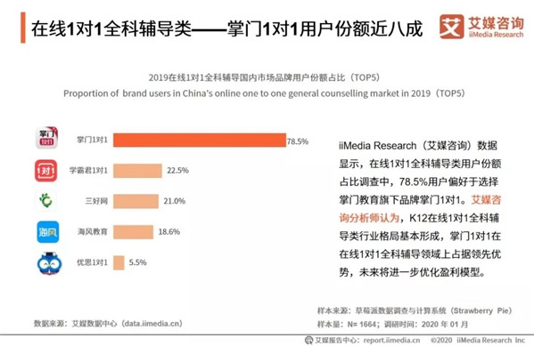 艾媒咨詢分析師認為,針對目標消費群體提供專業(yè)化的服務(wù),對教研、教學(xué)和技術(shù)等多個細分維度進行深耕,才能更好地滿足用戶需求,提升用戶體驗。如今,在線教育的“下半場”已經(jīng)開啟,機構(gòu)應(yīng)繼續(xù)向精細化運營和專業(yè)化方向發(fā)展。 K12在線教育頭部優(yōu)勢顯現(xiàn),優(yōu)質(zhì)資源將進一步聚攏 目前相對于其他在線教育細分領(lǐng)域,K12在線教育市場需求大,滲透率較高。iiMedia Research(艾媒咨詢)數(shù)據(jù)顯示,34.5%用戶表示對K12在線教育有一定了解。艾媒咨詢分析師認為,隨著社會對教育程度的重視度提高,市場需求增大,未來K12在線教育行業(yè)仍具有較大發(fā)展空間。 中國在線教育經(jīng)過近十二年發(fā)展,已涌現(xiàn)出早幼教、K12教育、高等教育、素質(zhì)教育、職業(yè)教育等在線教育細分領(lǐng)域,而在不少領(lǐng)域我們能看到賽道已經(jīng)跑出絕對的領(lǐng)先者。iiMedia Research(艾媒咨詢)數(shù)據(jù)顯示,在高等教育賽道上,網(wǎng)易公開課憑借48.6%的用戶偏好率,在高等教育領(lǐng)域占據(jù)領(lǐng)先地位;在少兒英語賽道上,VIPKID用戶份額超六成,展現(xiàn)出一騎絕塵之勢;在在線1對1全科輔導(dǎo)賽道上,掌門1對1用戶份額近八成,成為在線1對1全科輔導(dǎo)領(lǐng)域的一枝獨秀。