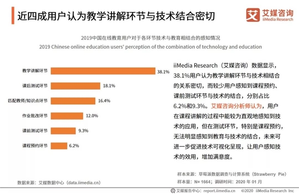 另一方面,直播教學(xué)成為促進平臺健康發(fā)展的重要形式。直播技術(shù)的運用彌補了錄播課程互動性弱的缺點,實現(xiàn)在線實時交流及促進教學(xué)場景化。綜合網(wǎng)校(如新東方在線、學(xué)而思網(wǎng)校)、K12教育(如掌門教育)、職業(yè)培訓(xùn)(如中公教育)等領(lǐng)域平臺紛紛采用直播課程的形式,同時搭建智能學(xué)習(xí)系統(tǒng),推動千人千面的個性化教學(xué),以達到更好的學(xué)習(xí)效果。隨著5G技術(shù)的推廣,直播教育的形式將愈加重要。5G技術(shù)將會極大解決目前直播教育中存在的畫面不流暢、內(nèi)容延遲等痛點,進一步豐富在線教育的形式,促進在線教育場景化,改善直播課程的質(zhì)量,優(yōu)化用戶學(xué)習(xí)體驗,直播教育形式將迎來新的發(fā)展階段。
