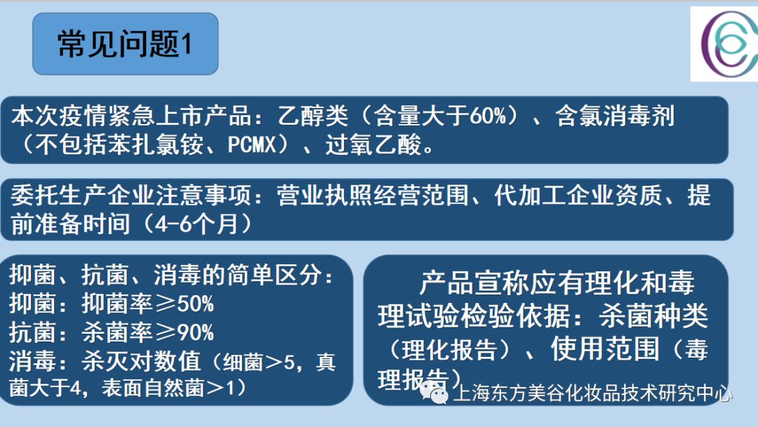 近期疫情高發(fā),與協(xié)會咨詢新增消毒產(chǎn)品事宜的增多,為避免盲目上馬帶來資金浪費,2月10日上午邀請南京佳原堂湯總工、湖北維美日化鄒總二位中心專家分別就:消毒產(chǎn)品申報備案與設(shè)備工藝、市場前景進行了研討。并就常見問題回答了大家的提問,中心會員南六平湖潘工、黃山荷繡生物余總、上海納緹生物唐總等也發(fā)表了自己看法。上百家公司人員參與了這次專題互動。上海東方美谷化妝品技術(shù)研究中心將這次研討整理了下,供大家參閱。 一、申證