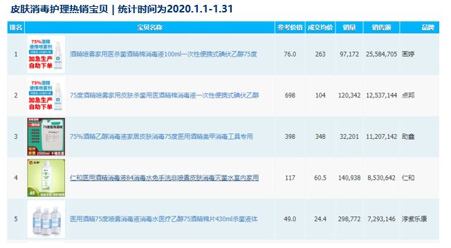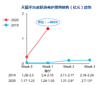 進一步觀察分周銷售表現(xiàn),可看到在疫情升溫后,消費者對于皮膚消毒護理產品(75%酒精噴霧劑、消毒液)需求提高,相似于防疫產品的供不應求現(xiàn)象,消毒相關產品未來幾周的銷售趨勢仍待觀察。