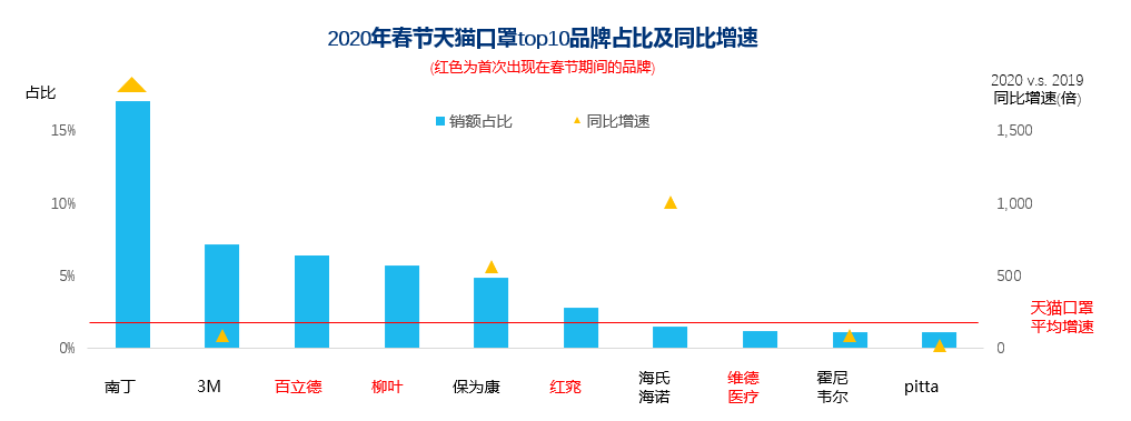 口罩頭部品牌表現(xiàn),南丁位居榜首,主要銷售嬰童口罩,且春節(jié)期間仍發(fā)貨成為品牌勝出的重要因素;百立德等4個國產品牌首次入榜春節(jié)檔,由于庫存?zhèn)湄泦栴}3M、霍尼韋爾、pitta增長則不及天貓整體;特殊時期防護用品統(tǒng)籌調配,未來品牌格局仍待觀察。
