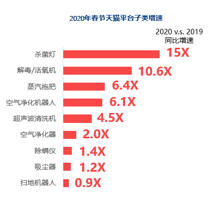抗疫(帶殺菌消毒功能)的家用電器 此次疫情對消費者的消費心理帶來的影響,進一步發(fā)現(xiàn)帶有“健康/殺菌/消毒屬性”的生活電器持續(xù)走熱,需求偏好進一步加強。即便是傳統(tǒng)品類吸塵器、空氣凈化器、掃地機器人受品質生活影響,依舊熱銷;蒸汽拖把、解毒/活氧機等新興品類有效解決疫情期間消毒需求,獲得快速發(fā)展。另外,在功能性燈具(殺菌燈)同樣迎來一波爆發(fā),值得留意。