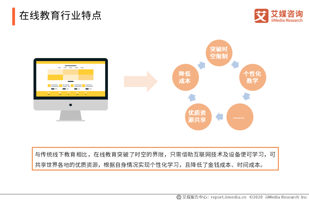 在政策利好、消費升級和技術浪潮的共同推動下,中國在線教育市場規(guī)模和用戶規(guī)模持續(xù)擴大。2020中國在線教育市場規(guī)模有望增至4538億元,用戶規(guī)模將增至2.59億人。四成用戶認為在線教育平臺的優(yōu)勢在于共享課程資源,教學資源豐富。五成用戶認為技術應用于教育的現(xiàn)狀達到預期。 核心觀點 在線教育市場規(guī)模不斷擴大,繼續(xù)發(fā)力下沉市場 中國在線教育市場規(guī)模近五年來一直保持穩(wěn)步增長。iiMedia Research(艾媒咨詢)數(shù)據(jù)顯示,在線教育市場規(guī)模未來將持續(xù)增長,預計2020年達到4538億元。此外,一二線城市在線教育市場漸趨成熟,而三四線城市市場仍處于初步發(fā)展階段,隨著教育重視程度的提高,下沉市場發(fā)展?jié)摿^大。 K12在線教育持續(xù)升溫,市場競爭激烈 受政策利好、社會教育意識加強以及中小學學生升學壓力的影響,K12在線教育市場需求較大。為了爭奪市場份額,K12在線教育于2019年暑假期間掀起低價課程促銷和高額廣告投放熱潮,市場競爭激烈。 在線素質(zhì)教育前景良好,思維和編程類最受用戶青睞 隨著80后、90后年輕父母對素質(zhì)教育的重視程度提高,素質(zhì)教育需求愈加迫切,未來發(fā)展前景較好。近四成受訪用戶認為思維編程類素質(zhì)教育可通過在線教育平臺發(fā)展。掌門少兒、編程貓等思維和編程類在線素質(zhì)教育平臺已具有較好的用戶基礎,松鼠AI也自主研發(fā)MCM思想能力方法系統(tǒng)以促進素質(zhì)教育發(fā)展。 以下為報告節(jié)選內(nèi)容 在線教育行業(yè)特點