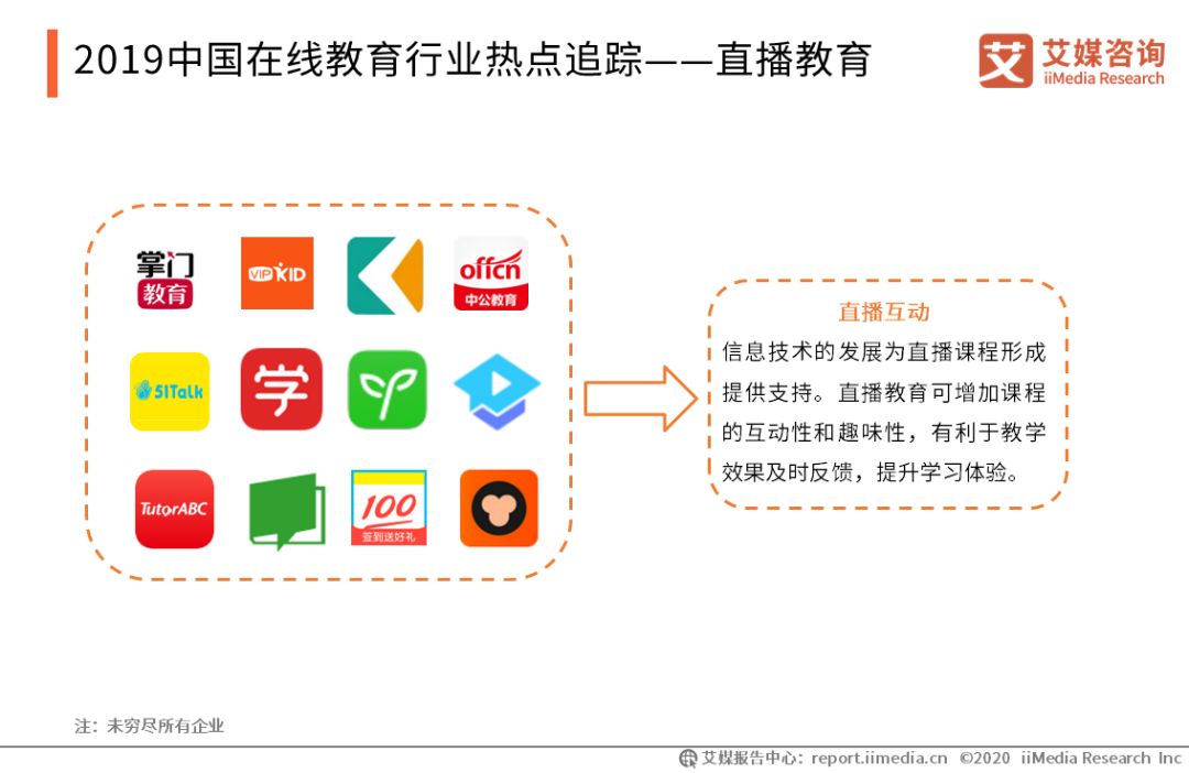 2019中國在線教育行業(yè)熱點追蹤——直播教育 直播技術的運用彌補了錄播課程互動性弱的缺點,實現(xiàn)在線實時交流及促進教學場景化。K12教育(如掌門教育)、綜合網(wǎng)校(如新東方在線)、職業(yè)培訓(如中公教育)等領域平臺紛紛采用直播課程的形式。艾媒咨詢分析師認為,5G技術的發(fā)展將進一步改善直播課程的質(zhì)量,提升教學和學習體驗,直播教育形式將迎來新的發(fā)展階段。