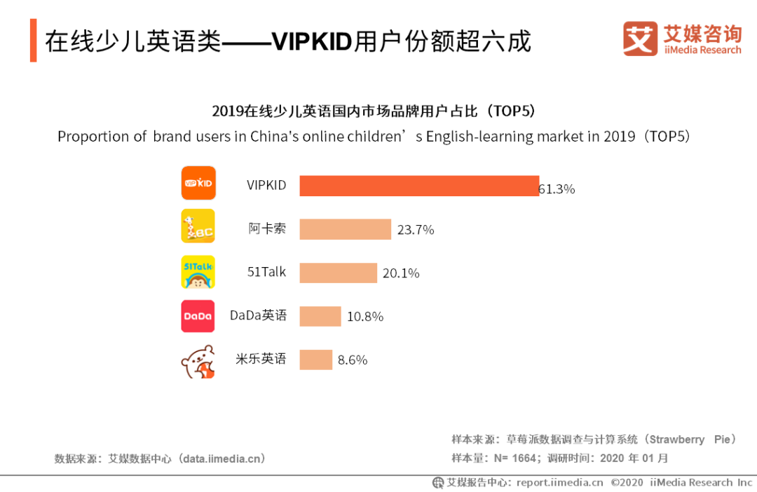 在線少兒英語類——VIPKID用戶份額超六成 iiMedia Research(艾媒咨詢)數(shù)據(jù)顯示,在少兒英語類調(diào)查中,61.3%用戶偏好VIPKID;23.7%用戶偏好阿卡索少兒英語。艾媒咨詢分析師認為,VIPKID在當前市場表現(xiàn)強勁,已初步奠定其在市場的領先地位。