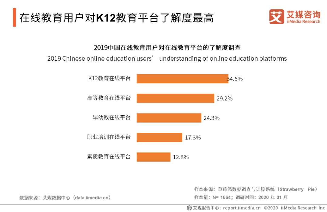 在線教育用戶對K12教育平臺了解度最高 iiMedia Research(艾媒咨詢)數(shù)據(jù)顯示,34.5%的用戶表示對K12在線教育有一定了解。艾媒咨詢分析師認為,相對于其他在線教育細分領域,K12在線教育市場需求大,滲透率較高。隨著社會對教育程度的重視度提高,中小學生升學壓力較大,未來K12在線教育行業(yè)仍具有較大發(fā)展空間。