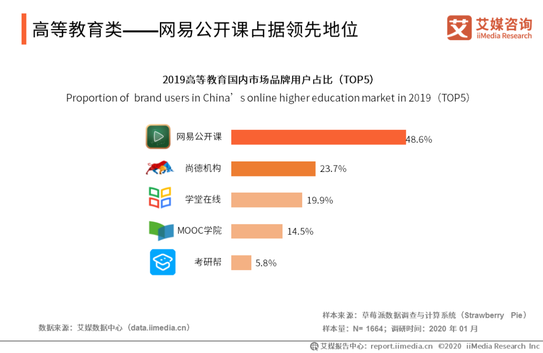 高等教育類——網(wǎng)易公開課占據(jù)領先地位 iiMedia Research(艾媒咨詢)數(shù)據(jù)顯示,在線高等教育類用戶偏好調(diào)查中,48.6%用戶偏好于選擇網(wǎng)易公開課,尚德教育和學堂在線緊隨其后,分別占比23.7%和19.9%。艾媒咨詢分析師認為,隨著高等教育入學人數(shù)增加,在線高等教育市場需求將繼續(xù)擴大,在線教育平臺應注重把控教育資源質(zhì)量,提升教育資源的豐富性,以獲得更大市場份額。