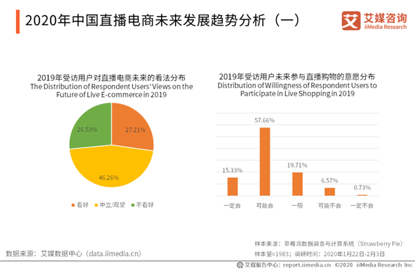 行業(yè)趨勢分析(節(jié)選): 2020年中國直播電商未來發(fā)展趨勢分析(一) iiMedia Research(艾媒咨詢)數(shù)據(jù)顯示,有27.21%的受訪用戶看好直播電商的未來發(fā)展,46.26%的受訪用戶持中立/觀望態(tài)度,26.53%的受訪用戶不看好直播電商。此外,從未參與過直播購物的受訪用戶中,超過半數(shù)表示未來可能會參與直播購物,15.33%的用戶表示一定會參加。艾媒咨詢分析師認(rèn)為,雖然當(dāng)前直播帶貨十分火爆,但直播電商是否是電商行業(yè)下一個風(fēng)口,大部分人還持觀望態(tài)度。