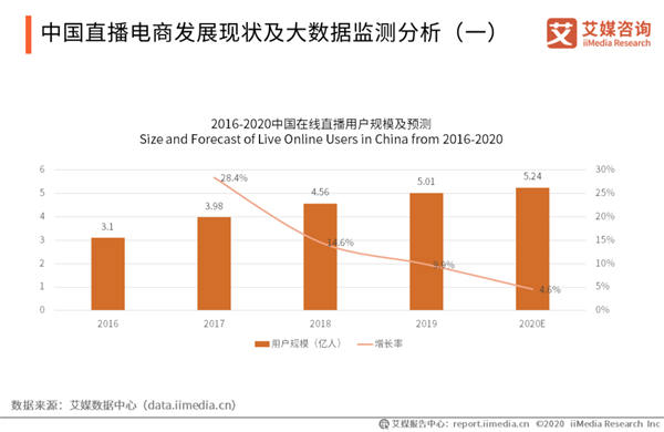 市場數(shù)據(jù)分析(節(jié)選): 中國直播電商發(fā)展現(xiàn)狀及大數(shù)據(jù)監(jiān)測分析(一) iiMedia Research(艾媒咨詢)數(shù)據(jù)顯示,到2020年中國在線直播用戶規(guī)模將達到5.24億人,涵蓋了游戲直播、秀場直播、生活類直播、電商直播等,說明觀看直播逐漸成為人們的上網(wǎng)習(xí)慣之一。艾媒咨詢分析師認(rèn)為,龐大的直播用戶體量是直播電商行業(yè)進行商業(yè)變現(xiàn)的前提之一。