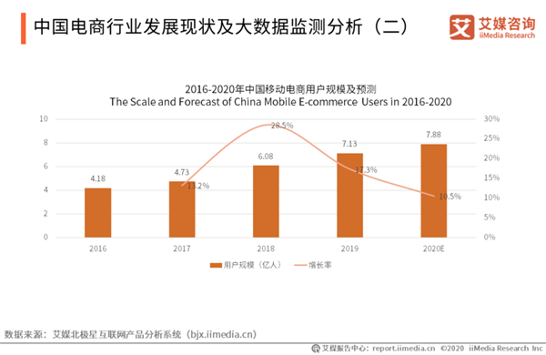 中國電商行業(yè)發(fā)展現(xiàn)狀及大數(shù)據(jù)監(jiān)測分析(二) iiMedia Research(艾媒咨詢)數(shù)據(jù)顯示,2020年移動電商用戶規(guī)模有望達到7.88億人,但增幅有所下降。艾媒咨詢分析師認(rèn)為,隨著電商體系在中國已發(fā)展成熟,用戶規(guī)模逐漸觸達網(wǎng)民規(guī)模天花板,流量獲取成本也越來越高,以“直播+電商” 模式的興起有可能成為電商行業(yè)的下一個風(fēng)口。