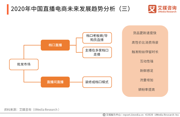 2020年中國直播電商未來發(fā)展趨勢分析(三) 艾媒咨詢分析師認(rèn)為,對于專業(yè)批發(fā)市場來說,直播是增加銷售、彌補線下渠道不足的新模式,并不能取代原有的模式。因此,檔口直播的形式既可以保留傳統(tǒng)批發(fā)市場原有的現(xiàn)場氛圍,給線上消費者營造一種高性價比的消費場景,同時具有增加店鋪流量、提高轉(zhuǎn)粉率、延長粉絲停留時長等優(yōu)勢。因此,檔口直播將會是直播電商一個非常重要的發(fā)展趨勢。