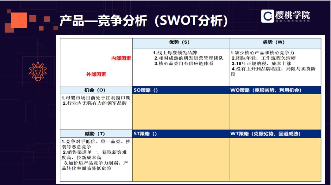 滲透力包括紙尿褲、嬰幼兒牛奶粉、睡袋、洗護(hù)用品等; 復(fù)購(gòu)力包括嬰幼兒牛奶粉、嬰童褲子、套裝、運(yùn)動(dòng)鞋等; 價(jià)格力包括紙尿褲、濕巾、手推車等,很多品牌是依靠產(chǎn)品顏值提升價(jià)格力的。紙尿褲是一個(gè)廝殺比較厲害的品類,但是在2019年依然有品牌脫穎而出,例如babycare,它整體的顏值是比較高的,從而拉升了價(jià)格力,可以對(duì)比一下它的價(jià)格和店鋪,憑借顏值增加了產(chǎn)品的溢價(jià)能力; 延展力包括嬰童板鞋、孕婦褲中的直筒褲、孕產(chǎn)修復(fù)儀中的產(chǎn)后塑形等儀器,以及孕婦裝里的孕產(chǎn)婦鈴鐺。另外舉一下之前在可優(yōu)比做過(guò)的一個(gè)品類作為例證,就是防摔枕。防止寶寶學(xué)步時(shí)仰摔到頭部,這一產(chǎn)品解決了用戶的痛點(diǎn),用戶自然會(huì)買單,這也是延展出來(lái)的一個(gè)產(chǎn)品。 1、根據(jù)GROW模型,打法沉淀 一是通過(guò)CRM,增加與該類人群的互動(dòng),持續(xù)召回老客,加強(qiáng)復(fù)購(gòu),老帶新裂變。購(gòu)買頻次為核心驅(qū)動(dòng)因子;利用其高頻購(gòu)買忠誠(chéng)度一特性,增強(qiáng)該策略人群與品牌的粘性。 二是廣泛吸引AI人群,站外種草,活動(dòng)前預(yù)熱,促進(jìn)該類人群對(duì)品牌首單購(gòu)買。購(gòu)買人數(shù)為核心驅(qū)動(dòng)因子;利用其人群增量,提高品類在該人群中的滲透能力。 三是品類核心人群,通過(guò)單品類輻射到品牌其他品類,先做單品類的爆破和擊穿,然后再延伸到其他品類,提高客單的連帶率。 四是新品發(fā)售&單品組套發(fā)售目標(biāo)人群,促進(jìn)高客單轉(zhuǎn)化。核心驅(qū)動(dòng)因子為頻次和客單價(jià);利用新品吸引購(gòu)買或者利用套裝增加策略人群的高客單購(gòu)買。 2、GROW產(chǎn)品模型 如何落地 首先是戰(zhàn)略規(guī)劃能力。我們發(fā)現(xiàn),遇到戰(zhàn)略轉(zhuǎn)型,很多時(shí)候企業(yè)會(huì)選擇全做或全不做,很少進(jìn)行針對(duì)性的側(cè)重和選擇。前者會(huì)導(dǎo)致企業(yè)的戰(zhàn)略資源被攤薄,執(zhí)行達(dá)不到效果;后者則會(huì)讓企業(yè)陷入溫水煮青蛙的境地。戰(zhàn)略其實(shí)就是做權(quán)衡,而 GROW 模型的目的正是協(xié)助企業(yè)更明智地做選擇。 其次是提升組織能力,包括商品開發(fā)、數(shù)字化營(yíng)銷、大數(shù)據(jù)分析等 ,特別需要建立統(tǒng)一的數(shù)據(jù)中臺(tái),整合各領(lǐng)域數(shù)據(jù),包括消費(fèi)者分群信息、消費(fèi)者線上及線下的購(gòu)物車信息、消費(fèi)者瀏覽行為信息、按品類的銷售信息、按促銷的銷售及利潤(rùn)信息等。這樣才能為后端的品類開發(fā)和前端營(yíng)銷部門提供明確的方向指導(dǎo)。 最后要改變傳統(tǒng)的工作方式,推行敏捷工作方法和鼓勵(lì)試錯(cuò)的創(chuàng)新文化。敏捷不僅僅指速度效率的提升,更是真正以客戶為中心,快速滿足客戶的需求和反饋;打破部門墻,加強(qiáng)團(tuán)隊(duì)協(xié)作;提升員工權(quán)限和主人翁意識(shí)。與數(shù)字原生企業(yè)相比,傳統(tǒng)消費(fèi)品企業(yè)的文化厭惡風(fēng)險(xiǎn),崇尚效率。然而互聯(lián)網(wǎng)平臺(tái)讓企業(yè)創(chuàng)新的成本大大降低,企業(yè)不妨將線上作為“嘗新”的測(cè)試平臺(tái),鼓勵(lì)快速創(chuàng)新、快速失敗,并根據(jù)關(guān)鍵數(shù)據(jù)指標(biāo)進(jìn)行快速迭代試錯(cuò),最終打造出爆款產(chǎn)品。 更加嚴(yán)謹(jǐn)?shù)淖霎a(chǎn)品—競(jìng)爭(zhēng)分析,就是SWOT分析,找到我們的優(yōu)勢(shì)和劣勢(shì),我們的機(jī)會(huì)和威脅都有哪些,內(nèi)部和外部因素都有哪些。