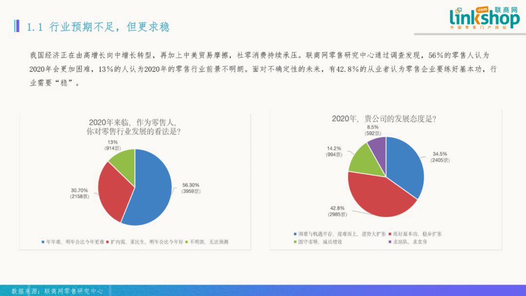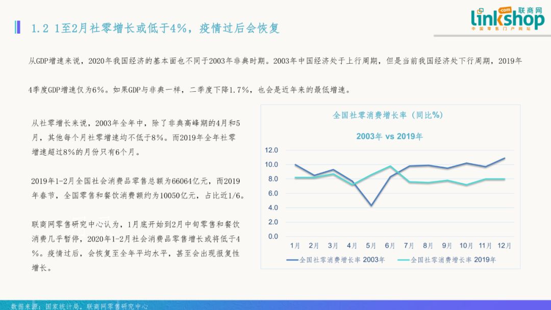 2020年春節(jié)期間,一場新冠肺炎疫情席卷全國。新冠肺炎疫情是新中國成立以來在我國發(fā)生的傳播速度最快、感染范圍最廣、防控難度最大的一次重大突發(fā)公共衛(wèi)生事件。經(jīng)過上下艱苦努力,如今疫情防控形勢正在向積極向好的態(tài)勢轉(zhuǎn)變。 在這場疫情中,餐飲零售等領(lǐng)域受波及影響最大。疫情何時(shí)能結(jié)束?它對經(jīng)濟(jì)和零售業(yè)會(huì)產(chǎn)生怎樣的影響?行業(yè)應(yīng)該怎么做?聯(lián)商網(wǎng)零售研究中心試圖從17年前非典部分?jǐn)?shù)據(jù)及當(dāng)下零售行業(yè)等數(shù)據(jù)來推斷新冠肺炎對零售行業(yè)的影響。 為此,2月25日,聯(lián)商網(wǎng)零售研究中心發(fā)布了《新冠肺炎對零售業(yè)影響分析報(bào)告》(下稱《報(bào)告》)。《報(bào)告》從疫情概述、非典疫情對零售行業(yè)影響、新冠肺炎疫情對零售行業(yè)影響、零售業(yè)應(yīng)對措施、疫情中零售業(yè)思考等角度切入,希望通過分析能夠勾勒出這次疫情對零售業(yè)的實(shí)際影響,并為未來發(fā)展提供思路參考。 一、非典疫情對零售行業(yè)影響 一)疫情高峰期GDP下降1.7% 非典期間,政府實(shí)施各種交通管制措施從2003年4月23日開始,到6月疫情基本結(jié)束取消。因此,非典疫情對經(jīng)濟(jì)影響主要在4月下旬和5月份。在非典疫情集中爆發(fā)的第二季度,中國GDP增速由一季度的10.8%減速至9.1%,不過三季度又迅速回升到10%。2003年全年GDP增速為10%,比2002年的9.1%上升明顯。 二、新冠肺炎疫情對零售行業(yè)影響 此次新冠疫情對零售行業(yè)短期內(nèi)影響較非典更強(qiáng),個(gè)別業(yè)態(tài)損失較大,但從長期看不影響零售行業(yè)的整體增長趨勢,電商、超市等業(yè)態(tài)反而在此次疫情中有了更多機(jī)會(huì)。 一)行業(yè)預(yù)期不足,但更求穩(wěn) 我國經(jīng)濟(jì)正在由高增長向中增長轉(zhuǎn)型,再加上中美貿(mào)易摩擦,社零消費(fèi)持續(xù)承壓。聯(lián)商網(wǎng)零售研究中心通過分析發(fā)出的7000余份有效調(diào)研問卷后發(fā)現(xiàn),56%的零售人認(rèn)為2020年會(huì)更加困難,13%的人認(rèn)為2020年的零售行業(yè)前景不明朗。面對不確定性的未來,有42.8%的從業(yè)者認(rèn)為零售企業(yè)要練好基本功,行業(yè)需要“穩(wěn)”。