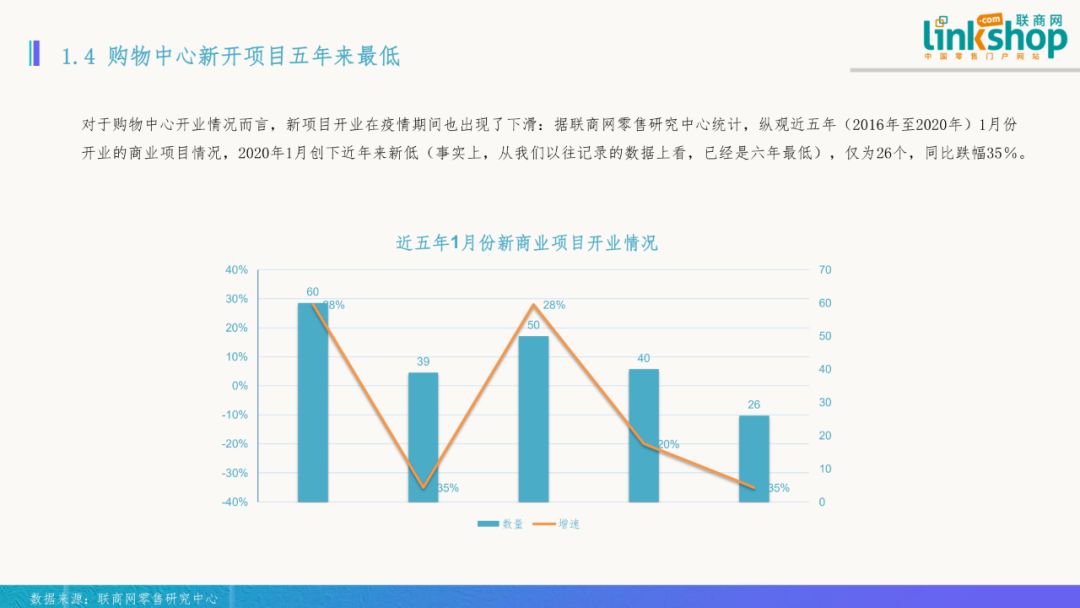 四)購物中心新開項(xiàng)目五年來最低 對于購物中心開業(yè)情況而言,新項(xiàng)目開業(yè)在疫情期間也出現(xiàn)了下滑?v觀近五年(2016年至2020年)1月份開業(yè)的商業(yè)項(xiàng)目情況,2020年1月創(chuàng)下了近年來新低(事實(shí)上,從我們以往記錄的數(shù)據(jù)上看,已經(jīng)是六年最低),僅為26個(gè),同比跌幅達(dá)35%。