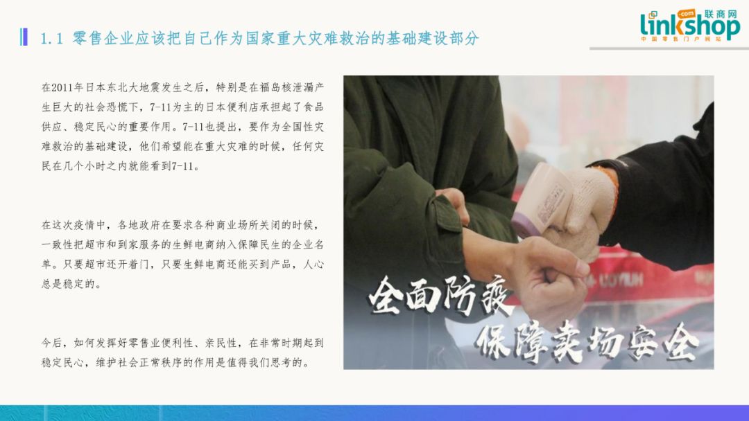 四)商場更需注意細(xì)節(jié) 建立完善的應(yīng)急體系 在此次疫情期間,大型商場是受損失最大的業(yè)態(tài)之一。商場感染的案例也最為驚心,如發(fā)生在天津?qū)氎姘儇洿髽堑囊咔橐褜?dǎo)致32例感染,超過1萬人居家隔離。商場作為人流密集場所,在平時(shí)就應(yīng)該更加強(qiáng)衛(wèi)生安全環(huán)境工作,如確保洗手間的洗手液不間斷供應(yīng),空氣環(huán)境加強(qiáng)持續(xù)監(jiān)測和優(yōu)化,注意賣場衛(wèi)生死角的清潔維護(hù),從而建設(shè)一個(gè)更綠色安全的消費(fèi)環(huán)境。同時(shí),對突發(fā)事件要進(jìn)一步建立和完善緊急應(yīng)對體系。 出品/聯(lián)商網(wǎng)零售研究中心 報(bào)告構(gòu)架及編寫審核/木魚 報(bào)告文字撰寫/陳新生 報(bào)告圖文美化/許弋諾 報(bào)告校對/諸振家 |