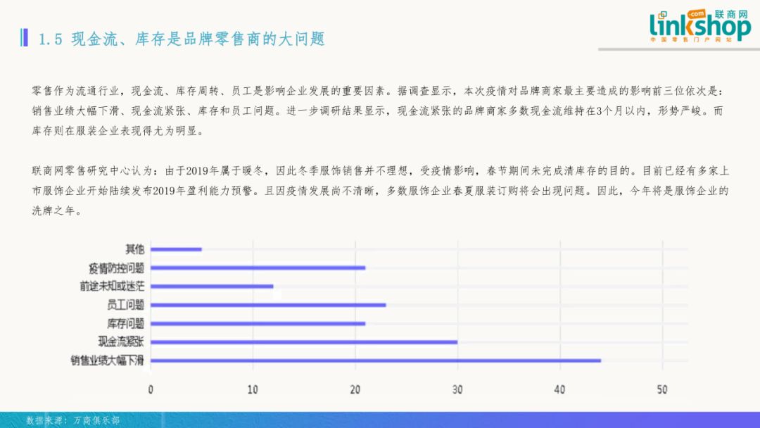 五)現(xiàn)金流、庫存是品牌零售商的大問題 零售作為流通行業(yè),現(xiàn)金流、庫存周轉(zhuǎn)、員工是影響企業(yè)發(fā)展的重要因素。據(jù)調(diào)查顯示,本次疫情對品牌商家最主要造成的影響前三位的依次是:銷售業(yè)績大幅下滑、現(xiàn)金流緊張、庫存和員工問題。進(jìn)一步調(diào)研結(jié)果顯示,現(xiàn)金流緊張的品牌商家多數(shù)現(xiàn)金流維持在3個(gè)月以內(nèi),形勢嚴(yán)峻。而庫存則在服裝企業(yè)表現(xiàn)得尤為明顯。 聯(lián)商網(wǎng)零售研究中心認(rèn)為,由于2019年屬于暖冬,因此冬季服飾銷售并不理想,受疫情影響,春節(jié)期間未完成清庫存的目標(biāo)。目前已經(jīng)有多家上市服飾企業(yè)開始陸續(xù)發(fā)布2019年盈利能力預(yù)警。且因疫情發(fā)展尚不清晰,多數(shù)服飾企業(yè)春夏服裝訂購將會(huì)出現(xiàn)問題。因此,今年將是服飾企業(yè)的洗牌之年。