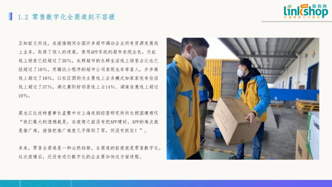 二)零售數(shù)字化全渠道刻不容緩 正如前文所述,在疫情期間全國許多超市調(diào)動(dòng)企業(yè)所有資源發(fā)展線上業(yè)務(wù),取得了驚人的進(jìn)展。使用APP系統(tǒng)的超市表現(xiàn)出色,天虹線上銷售已經(jīng)超過30%,永輝生活線上銷售占比也已經(jīng)超過10%。用騰訊小程序的超市公司表現(xiàn)也非常喜人,步步高線上超過10%,以社區(qū)團(tuán)購為主要線上業(yè)務(wù)模式如家家悅有些門店線上超過37%,湖北襄陽好鄰居線上占14%、湖南佳惠線上超過10%。 未來,零售全渠道是一種必然趨勢。全渠道的前提就是零售數(shù)字化。這次疫情后,還沒有進(jìn)行數(shù)字化的企業(yè)要加快這方面進(jìn)程。