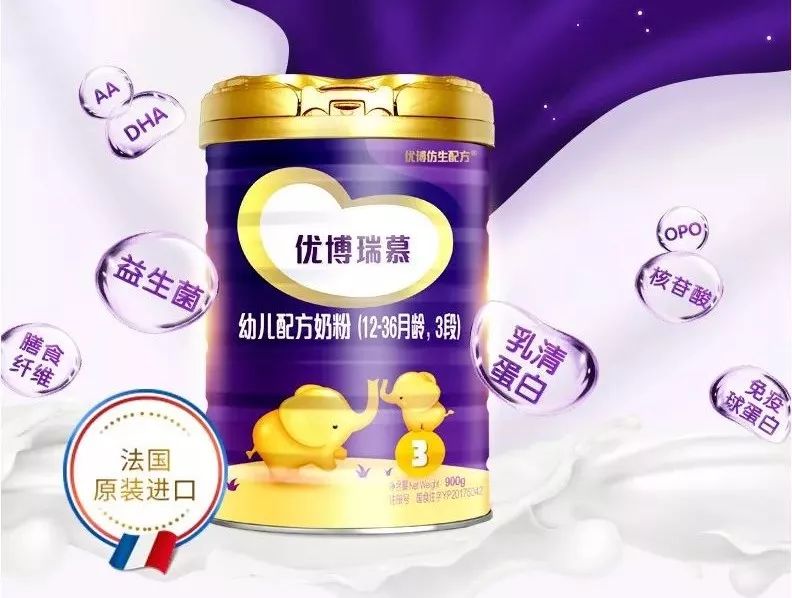 比如優(yōu)博瑞慕,大面積典雅紫色在一眾淺色奶罐陳列中顯得醒目,罐體正中金色的一對大象母子嬉戲的場景,溫馨而不失活力,盡顯高端品位;