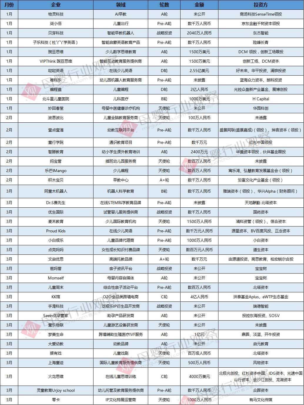 其中,母嬰產品消費市場方面,2019年飛鶴港股上市,君樂寶“單飛”加速沖擊IPO,蒙牛70億收購貝拉米,都成為國產奶粉發(fā)展過程中的標志性事件。此外,母嬰細分市場爆發(fā),如嬰兒喂養(yǎng)、玩具益智、孕產婦相關等消費大漲,消費升級加速推動母嬰產品迭代與服務升級,細分領域跑出更多黑馬,如babycare在2019年8月就被爆料以30億的估值獲紅杉資本3億投資,占股10%。此外,兒童智能早教產品被資本熱捧,牛聽聽、物靈科技luka繪本閱讀機器人、杜丫丫早教機等均獲千萬級融資。 母嬰服務市場投融資方面,2019年線下親子樂園、孕產服務等共有8家企業(yè)獲得融資,投融資金額超10億。出生率下降的背景下,做好存量市場,深挖單客經濟,是母嬰企業(yè)最重要的戰(zhàn)場,服務成為非常重要的一環(huán)。從消費端來看,對于追逐服務品質的母嬰高凈值人群而言,價格不是最關鍵的,服務產品是否能真正滿足用戶需求才是最重要的,雖然資本寒冬對母嬰行業(yè)有影響,但是在這種理性的環(huán)境下優(yōu)質企業(yè)更受歡迎。 疫情陰影籠罩之下,母嬰各行各業(yè)都有所受損,相信疫情帶來的短期波動不會影響一家優(yōu)秀企業(yè)的長期價值,經歷過逆境中千錘百煉的公司,更具投資價值! 附全年投融資數(shù)據(jù)