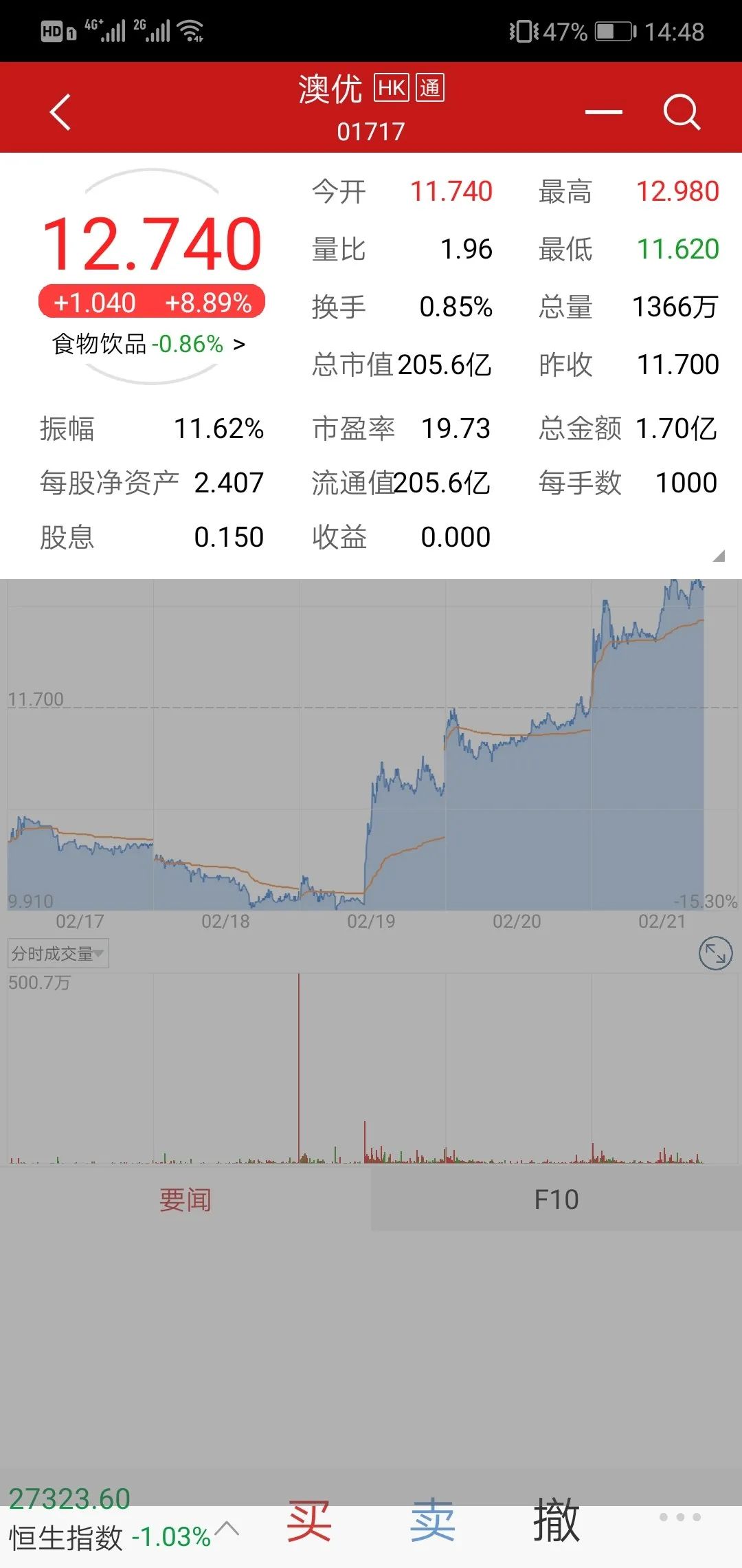 昨天,澳優(yōu)總市值突破兩百億大關(guān)。據(jù)悉,澳優(yōu)2月19日發(fā)布2019年正面盈利預(yù)告,自公告發(fā)出后,澳優(yōu)股票連續(xù)三天大漲,今日總市值突破200億港元,截至發(fā)稿之時(shí),澳優(yōu)股價(jià)12.740港元/股,今日最高峰時(shí)已達(dá)12.980港元/股。