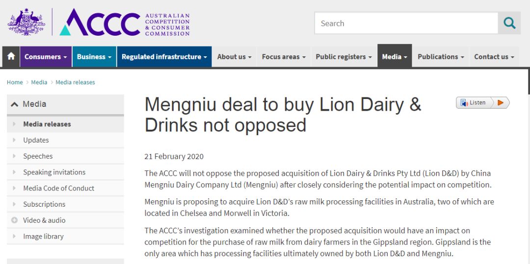 蒙牛收購(gòu)澳大利亞第二大乳企Lion-Dairy& Drinks拿到了一張來(lái)自澳方的關(guān)鍵“通行證”。 昨天,澳洲公平競(jìng)爭(zhēng)和消費(fèi)者委員會(huì)(ACCC)方面宣布,在仔細(xì)評(píng)估對(duì)競(jìng)爭(zhēng)的潛在影響后,其不會(huì)反對(duì)蒙牛收購(gòu)Lion-Dairy & Drinks的提議。這意味著,蒙牛該樁交易在競(jìng)爭(zhēng)審查上前進(jìn)了一步。