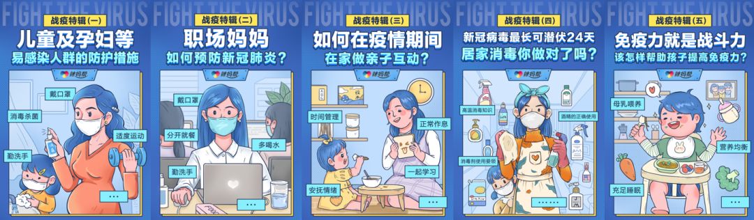 發(fā)揮內(nèi)容優(yōu)勢 出品戰(zhàn)疫特輯 國家衛(wèi)生健康委指出,兒童和孕產(chǎn)婦是新型冠狀病毒肺炎的易感人群,為此辣媽幫內(nèi)容團隊緊急研制“戰(zhàn)疫特輯”系列專題,生產(chǎn)了易感人群的防護(hù)措施、職場媽媽防護(hù)問題、疫情期間親子互動建議、居家消毒、如何緩解心理焦慮、特殊時期產(chǎn)檢指南等方向的內(nèi)容,用深入淺出的文字和詼諧幽默的插圖,讓易感人群零壓力了解和防御新冠病毒。