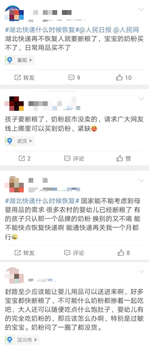 “我的孩子沒有奶粉吃了” 自疫情爆發(fā)以來,湖北各市接連封城,不但阻止了人員流動,也阻擋車輛的流通,很多物流公司都無法進入,盡管多數(shù)奶粉企業(yè)的生產(chǎn)都足以保障市場供應,但物流“失靈”,貨物進出不便。進貨難、配送難成為當?shù)啬笅腴T店的常態(tài),部分門店奶粉庫存僅夠維持一個星期。 湖北武漢、孝感等多地的奶粉一罐難求,每一罐都來之不易。由于疫情影響,湖北宜昌市興山縣灘坪村還在封路,村民家里1歲多的孩子已經(jīng)多天沒有奶粉喝,此前預定好的奶粉在縣里也無法拿回家,無奈之下向消防求助。消防員驅(qū)車30公里去縣城取奶粉,村干部在村口接力,才將奶粉順利送到村民手中。 其實像這樣,奶粉緊缺的事情還有很多,在微博上輸入“奶粉斷糧”、“寶寶斷糧”等關鍵詞,立即會搜出大量口糧告急的吶喊,“求助奶粉、請求通物流買奶粉”等很多相關內(nèi)容比比皆是,同時當?shù)氐暮芏嗄笅氲曛魍瑯右苍跒槟谭郯l(fā)愁?梢姡鉀Q嬰幼兒口糧售賣及配送問題已經(jīng)迫在眉睫。
