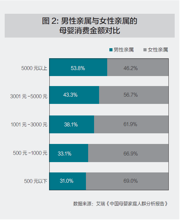 根據(jù)父母在育兒過程中的分工,我們將母嬰消費(fèi)者分為職業(yè)玩家和“人民幣”玩家。職業(yè)玩家以母親居多,她們更注重產(chǎn)品性價(jià)比,相信親朋好友和大V的推薦。“人民幣”玩家則以父親和親友居多,他們預(yù)算充足,對(duì)價(jià)格不敏感。根據(jù)艾瑞的《中國(guó)母嬰家庭人群分析報(bào)告》顯示,在5,000元以下母嬰產(chǎn)品月開銷中,女性親屬居多,在月開銷5,000元以上的人群中,男性居多。(如圖2)