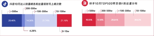 ▲一年里,抖音、快手昵稱完全相同的賬號數(shù)量變化趨勢及內(nèi)容類別,數(shù)據(jù)來源:卡思數(shù)據(jù) 短視頻/直播帶貨的崛起,也為腰、尾部(100萬粉絲以下)賬號變現(xiàn)提供了新通路,有助于內(nèi)容生態(tài)的持續(xù)繁榮。