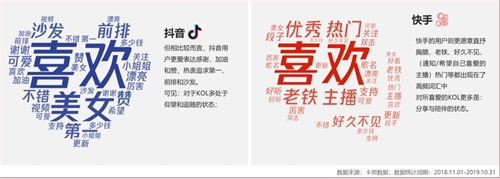 ▲抖音VS快手:各粉絲量級KOL視頻贊評比分布,比值越小,互動越充分,數(shù)據(jù)來源:卡思數(shù)據(jù) 從粉絲互動熱詞看:無論是抖音還是快手,用戶對于喜歡的內(nèi)容,都會積極發(fā)聲,但相比于抖音用戶更愛獲得認同(沙發(fā)、第一)、表達感謝,快手用戶更愿意表達“親密”和說出自己的期待。