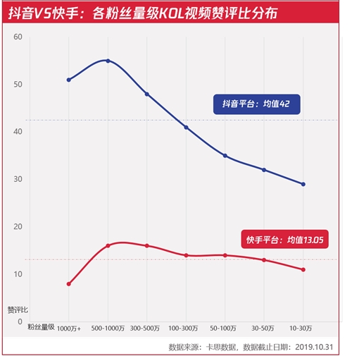 ▲抖音VS快手:KOL粉絲畫像,數(shù)據(jù)來源:卡思數(shù)據(jù) 02 從粉絲的互動活躍度看:抖音KOL視頻贊評比比值為42:1,而快手為13.05:1,可見:快手老鐵“直抒胸臆”的熱情并未減退;相較抖音,快手超頭KOL表現(xiàn)更搶眼,8個贊即能收獲1個評,也說明基于“直播”和“短視頻”等建立起的信任關(guān)系,并不會因為粉絲基數(shù)的龐大而削弱。