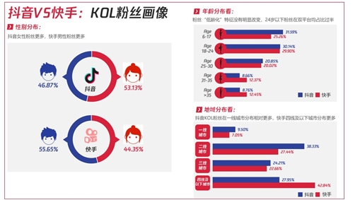 ▲短視頻平臺(除Bilibili外)頭、肩、腰、尾部KOL重定義,數(shù)據(jù)來源:卡思數(shù)據(jù) Part.2 典型平臺:抖音VS快手發(fā)展篇 01 分析抖音、快手的KOL畫像和粉絲畫像,我們能夠看到:抖音女性創(chuàng)作者(KOL)、女性粉絲占比更多,而快手男性創(chuàng)作者和男性粉絲更多。 從創(chuàng)作者地域分布上看:抖音一、二線創(chuàng)作者高度集中(占比74.92%)、快手創(chuàng)作者則相對下沉,三四線占比49.02%,更為貼合短視頻用戶畫像。從粉絲地域分布看,快手對于四線及以下市場覆蓋更深入(達42.84%),下沉市場的“老鐵”們更愿意圍繞在快手KOL身后深度活躍。