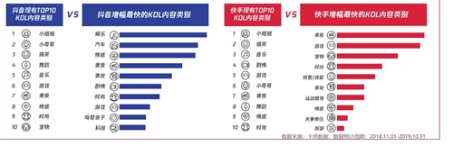 ▲抖音VS快手:2019用戶年度評論詞云,數(shù)據(jù)來源:卡思數(shù)據(jù) 03 從年度增幅最快的KOL內(nèi)容類型看:抖音顯性垂直,越是“小”的垂類,增幅越大,以汽車、情感、美食、美妝等最為典型,處于內(nèi)容大爆發(fā)期,此外,追逐流量的娛樂類賬號也增幅較快; 快手小類別提升幅度相較抖音小,但內(nèi)容多元化趨勢不可擋:美食、游戲、寵物、時尚等領(lǐng)域的垂類賬號都加快在快手布局。 與此同時,我們也特別研究了卡思數(shù)據(jù)于2019年新增的內(nèi)容標(biāo)簽,發(fā)現(xiàn):無論是抖音,還是快手,來自各領(lǐng)域的種草/測評類賬號在雙平臺快速增長;而知識資訊、文化藝術(shù)類賬號也增幅迅速。