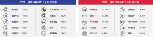 ▲2018年10-2019年10月:增粉最快的KOL(不含明星、媒體及藍V號),數(shù)據(jù)來源:卡思數(shù)據(jù) Part.3 抖音&快手:KOL營銷篇 01 從2019年卡思數(shù)據(jù)所采集的投放KOL最多的廣告主行業(yè)看:美妝日化在抖音投放最多;電商平臺在快手投放最高。而從投放行業(yè)集中度看:抖音也遠不如快手的品牌集中度高。在快手,效果類廣告主占據(jù)絕大比例,來自電商平臺、游戲和IT/網(wǎng)服類占比KOL投放的7成以上,從投放品牌看,投放KOL最多的20個品牌僅占比抖音KOL投放的37.2%,而快手占比60%以上。