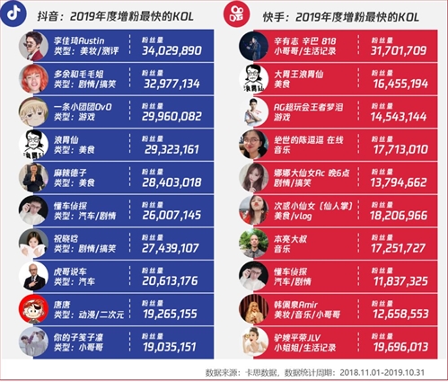▲抖音VS快手:2019年1-10月數(shù)量增幅最快的KOL內(nèi)容類別,數(shù)據(jù)來源:卡思數(shù)據(jù) 04 深入研究年度增粉最快的500位KOL,卡思數(shù)據(jù)則發(fā)現(xiàn):高增粉賬號中,劇情/搞笑類占比仍是最高,這是由用戶觀看短視頻的核心動機決定的,也跟劇情/搞笑類內(nèi)容積極創(chuàng)新不無關(guān)系。 具體分析卡思數(shù)據(jù)采集的抖音、快手2018年10月-2019年10月,一年時間里增粉最快的10位紅人(不含明星、媒體及藍V賬號)看,要恭喜:浪胃仙和懂車偵探,喜提雙平臺增粉TOP10桂冠,從增粉最多的10個紅人也能清晰看到:無論在抖音還是快手,都呈現(xiàn)出較強的垂直化趨勢。