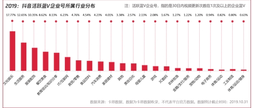 ▲2019年1-10月:最受美妝品牌投放歡迎的KOL,數(shù)據(jù)來源:卡思數(shù)據(jù),數(shù)據(jù)為卡思商業(yè)版“品牌追蹤”功能采集到的品牌在抖音平臺投放數(shù)據(jù),不代表平臺官方 Part.4 抖音:藍V運營篇 01 從抖音藍V發(fā)展現(xiàn)狀看:卡思數(shù)據(jù)平臺采集的活躍藍V(指30日內(nèi)發(fā)布視頻數(shù)≥1條)數(shù)量達到了15.8萬個,相比去年同期,增長了11.19倍。 而從藍V企業(yè)號所屬行業(yè)分布看:仍以文化娛樂行業(yè)占比最高,其次是來自生活服務(wù)、服裝配飾、餐飲美食領(lǐng)域的藍V企業(yè)號增幅最快,分析認為:這類型賬號品牌集中度低,與人們的日常生活息息相關(guān),且多能結(jié)合場景、情景高頻產(chǎn)出內(nèi)容。當(dāng)然,也與抖音藍V合作商家下沉有關(guān)。