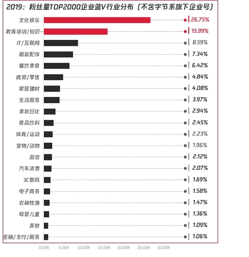 ▲2019年:抖音藍V企業(yè)號所屬行業(yè)分布(不含媒體、政務(wù)、機構(gòu)藍V),數(shù)據(jù)來源:卡思數(shù)據(jù),不代表平臺官方 02 分析粉絲量TOP2000的企業(yè)號,卡思數(shù)據(jù)發(fā)現(xiàn)呈兩個“極端”方向發(fā)展: 一方面,頭部藍V增粉超速,輕松越過百萬粉絲線; 另一方面:強品牌屬性的企業(yè)號在粉絲量TOP2000賬號中更少見:好內(nèi)容多由文化娛樂、教育培訓(xùn)類機構(gòu)打造,憑借先天的內(nèi)容優(yōu)勢及明星/專家流量,圈粉無數(shù),占據(jù)了粉絲量TOP2000藍V的42.74%。其次是深諳內(nèi)容營銷的IT/互聯(lián)網(wǎng)行業(yè)表現(xiàn)出眾。