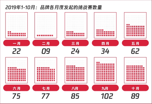 02 據(jù)卡思數(shù)據(jù)統(tǒng)計:2019年1-10月,卡思數(shù)據(jù)采集到的由品牌(不含:字節(jié)系、旅游機構(gòu)、政府、媒體等)發(fā)起的挑戰(zhàn)賽共計579場(含超級、品牌和區(qū)域挑戰(zhàn)賽)。