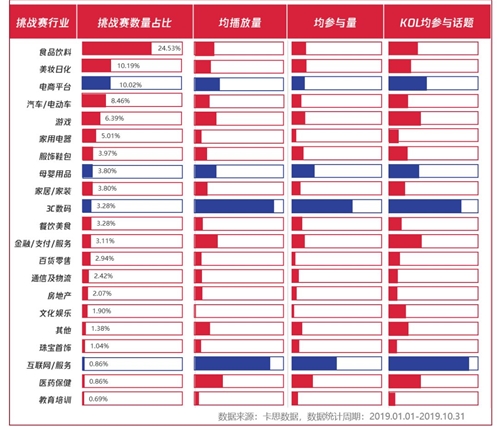 ▲2019年1-10月,品牌在各月度發(fā)起的挑戰(zhàn)賽數(shù)量,數(shù)據(jù)來源:卡思數(shù)據(jù) 相較上半年,下半年品牌發(fā)起的挑戰(zhàn)賽熱度明顯提升。從發(fā)起行業(yè)看,以食品飲料發(fā)起量最多(占比24.53%),包攬了1-10月里,9個月發(fā)起挑戰(zhàn)賽數(shù)量第1的位置,不僅投放力度大,投放品牌也多,以伊利和蒙牛旗下各品牌線投放最為典型,多會圍繞常規(guī)品牌造勢和產(chǎn)品上新/推廣兩大核心目標(biāo)發(fā)起挑戰(zhàn);其次是由美妝日化行業(yè)和電商平臺發(fā)起的挑戰(zhàn)賽較多,在Q3季度,美妝日化品牌成為挑戰(zhàn)賽發(fā)起的?。 03 分析579場挑戰(zhàn),發(fā)現(xiàn):無論是聚合頁播放量還是參與量,相較去年,都未出現(xiàn)明顯提升。但更多擁有著優(yōu)質(zhì)玩法、創(chuàng)意和資源投入的挑戰(zhàn)賽出現(xiàn),曝光量過百億,參與次數(shù)過百萬的挑戰(zhàn)賽已出現(xiàn)。 其中,以3C數(shù)碼行業(yè)最會玩,播放量最高的10場挑戰(zhàn),4席出自3C數(shù)碼行業(yè)之手。火星營銷建議品牌加大對挑戰(zhàn)賽價值的“重視”:要么不投,投即深刻!