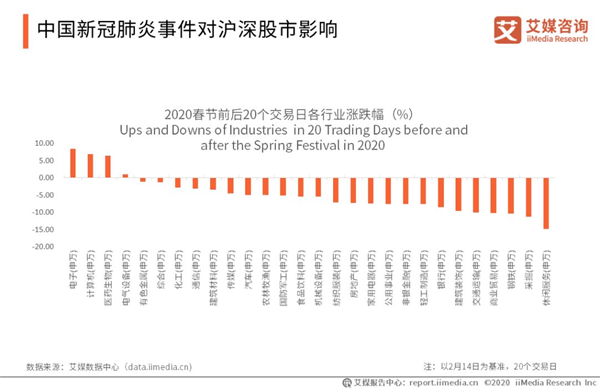 中國新冠肺炎事件對滬深股市影響 數(shù)據(jù)顯示,新冠肺炎爆發(fā)以來,滬深兩市反應(yīng)強烈。申萬28個一級行業(yè)春節(jié)前后20個交易日內(nèi)總體呈現(xiàn)漲少跌多態(tài)勢,其中電子、計算機、醫(yī)藥生物漲幅靠前,休閑服務(wù)行業(yè)跌幅最大,下跌近15%。艾媒咨詢分析師認(rèn)為,疫情之下,餐飲、旅游、交通運輸?shù)刃袠I(yè)受損嚴(yán)重,而生鮮配送、在線醫(yī)療、在線辦公、在線教育、游戲娛樂等各類線上業(yè)務(wù)組成假期里的“宅經(jīng)濟”,在2020年初成為彎道超車的大熱風(fēng)口。