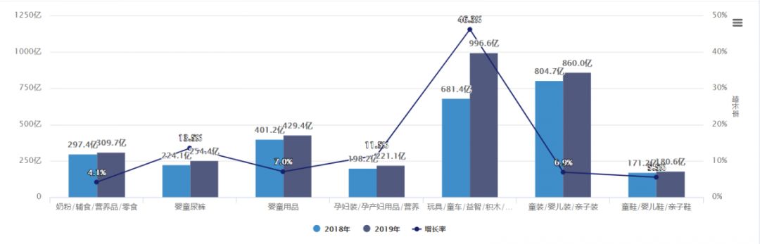 嬰兒食品增速下滑為個位數(shù) 從數(shù)據(jù)上看,幾大類目都得到了不同程度的增長,其中嬰兒食品(奶粉/輔食/營養(yǎng)品/零食)增速下滑明顯,增速僅為4.1%,成為增速最低的類目,熱度持續(xù)降低。