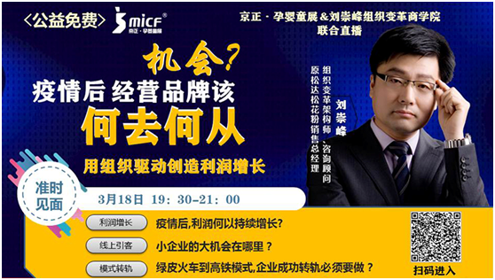 京正·孕嬰童展直播第一講即將開啟~中國嬰童招商網(wǎng)協(xié)辦 時(shí)間:3月18日(周三)19:30 【直播主題】 《疫情彎道超車的新風(fēng)口,用組織驅(qū)動(dòng)創(chuàng)造利潤增長》 【直播導(dǎo)師】 劉崇峰 組織變革架構(gòu)師、咨詢顧問 原松達(dá)松花粉銷售總經(jīng)理 【核心話題】 •疫情后,利潤何以持續(xù)增長? •小企業(yè)的大機(jī)會(huì)在哪里? •綠皮火車到高鐵模式,企業(yè)成功轉(zhuǎn)軌必須要做?