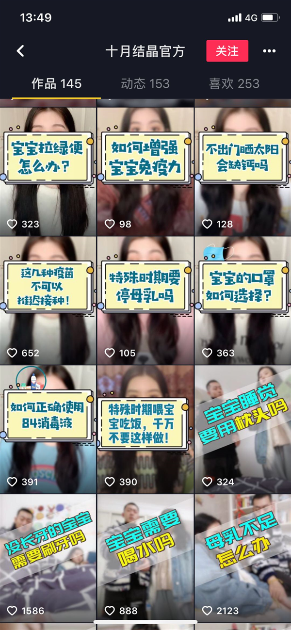 抖音賬號@十月結(jié)晶官方 視頻封面截圖 濾鏡/視角/拍攝/剪輯:畫面呈現(xiàn)的方式多元化 動作/環(huán)節(jié):在視頻關(guān)鍵節(jié)點、笑點處使用特定的聲效,為你的視頻持續(xù)提供記憶點 詞匯/對白/聲音:持續(xù)使用標志語音,類似廣播音,將一些雞湯進行幽默包裝,輸出內(nèi)容 通過內(nèi)容和形式系列化方案的組合 維持長期價值 我們可以對內(nèi)容和形式進行不同的疊加以實現(xiàn)藍V的長期內(nèi)容價值,針對母嬰行業(yè)來說,我們通過一些實例來看,兩者如何有機結(jié)合實現(xiàn)以下四個特定價值: 新知: 功能向+動作/環(huán)節(jié)、詞匯/對白/聲音 傳遞“新知”主要依靠功能向的系列化劇集形成知識點矩陣。而功能向主要依靠口碑、旁白和字幕來輸出大量內(nèi)容,在開頭結(jié)尾加一些特定的小環(huán)節(jié),或者用極有辨識度的聲音來演繹,都會增色不少,讓傳播更有力度。對于母嬰行業(yè),新知的價值非常明顯,嬰幼兒成長中會遇到形形色色問題,這也是寶媽寶爸比較關(guān)注的點。功能向系列化內(nèi)容可以有效地引導(dǎo)觀眾了解行業(yè)知識,進而產(chǎn)生關(guān)注行為。 有趣: 劇情向+場景/背景、動作/環(huán)節(jié) 最適合傳遞“有趣”的是系列化劇情向內(nèi)容,形態(tài)各異的情景喜劇是很多品牌的選擇。相應(yīng)地,貼近生活化的場景、標簽化的搞笑動作或者環(huán)節(jié)、幽默詞匯對白聲效都是不可或缺的形式系列化方式。母嬰行業(yè)可以多考慮以家庭親子關(guān)系展開的情景系列劇。 流行: 視覺向、功能向+封面/包裝